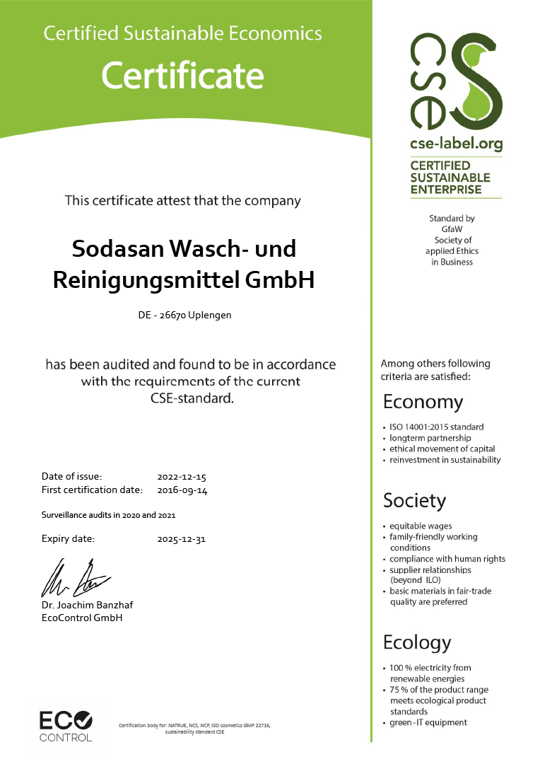Sertifikalı organik bitkisel sabun ve narenciye gücü içeren güçlü formülü, kiri ve yağı kalıntı bırakmadan güvenilir bir şekilde temizler.Nature Care Product, CSE Geprüft Nachhaltiges Unternehmen ve Vegan sertifikalıdır.